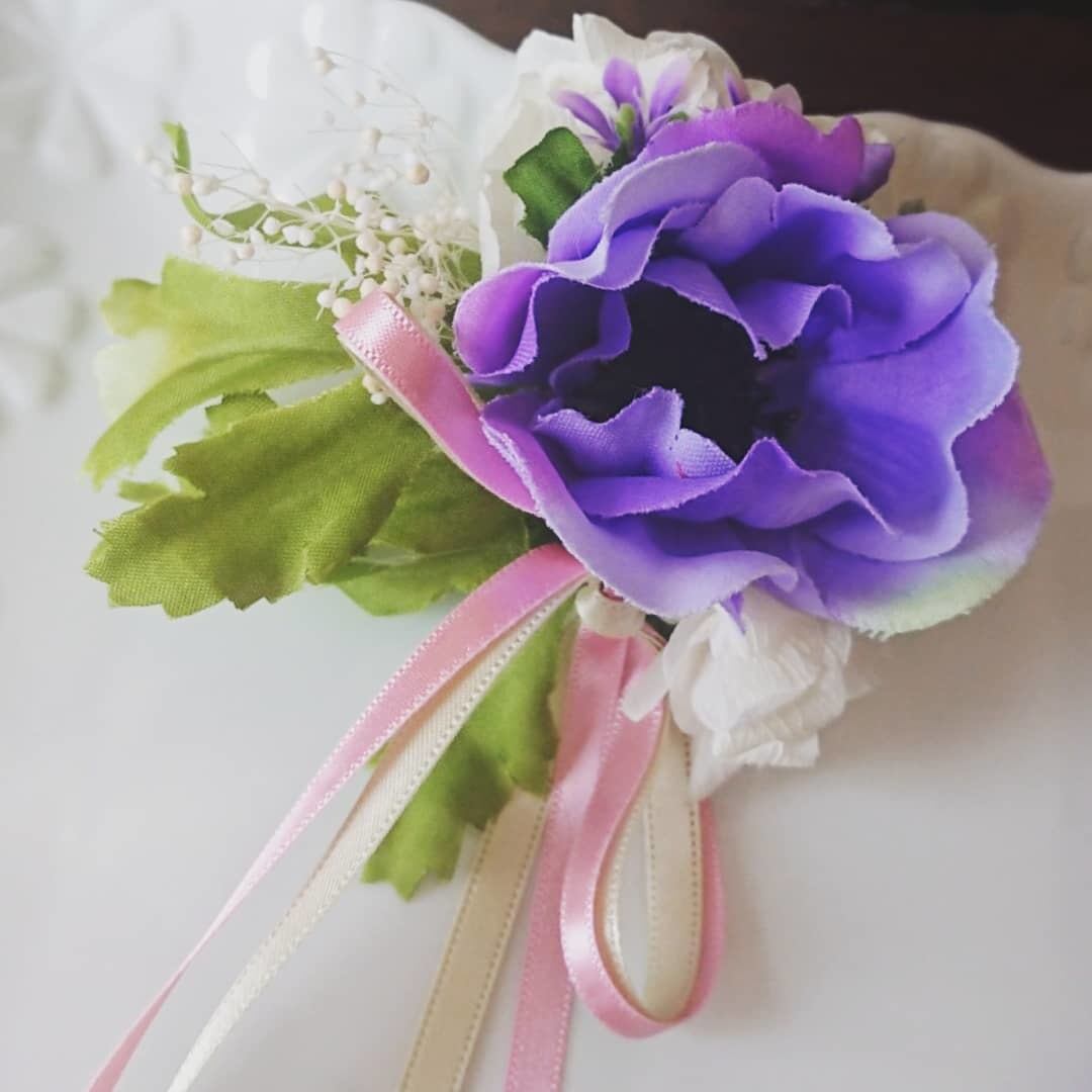 こちらはパープルのアネモネで親子コーデしたお揃いのコサージュです。